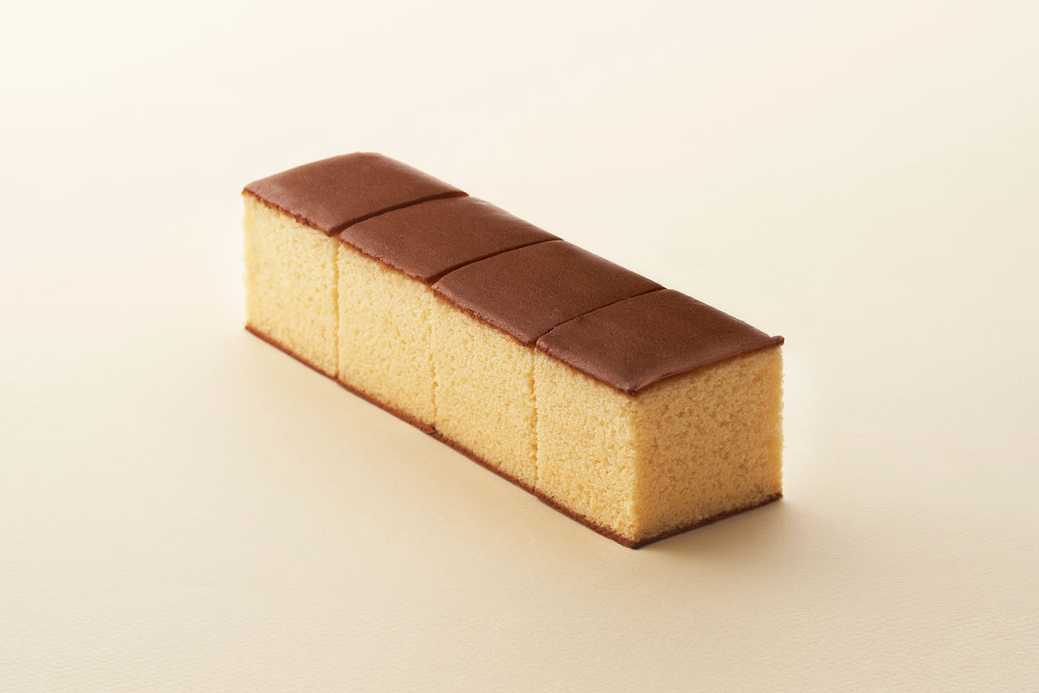 新鮮な福岡県糸島産卵、国産小麦粉、砂糖、水飴、蜂蜜を使い、きめ細かくしっとりと焼き上げました。創業当時からの味は、季節によって変わる気温や湿度を見極め、丹精込めて手焼きしています。底はざらめ糖のないタイプ。カステラは4切れにカットしてお包みしております。