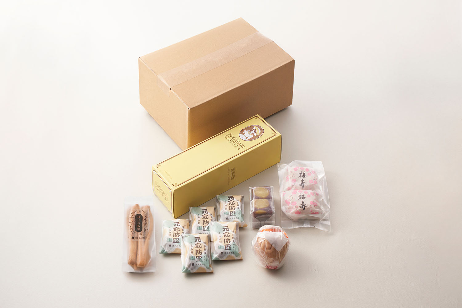 人気の『元寇防塁』『博多長崎屋カステラ』に『梅寿』 『栗羊羹』『はまの松葉』『おしるこ』を詰め合わせました。素材にこだわり、保存料や防腐剤などは一切使わない手づくりのおいしさです。
