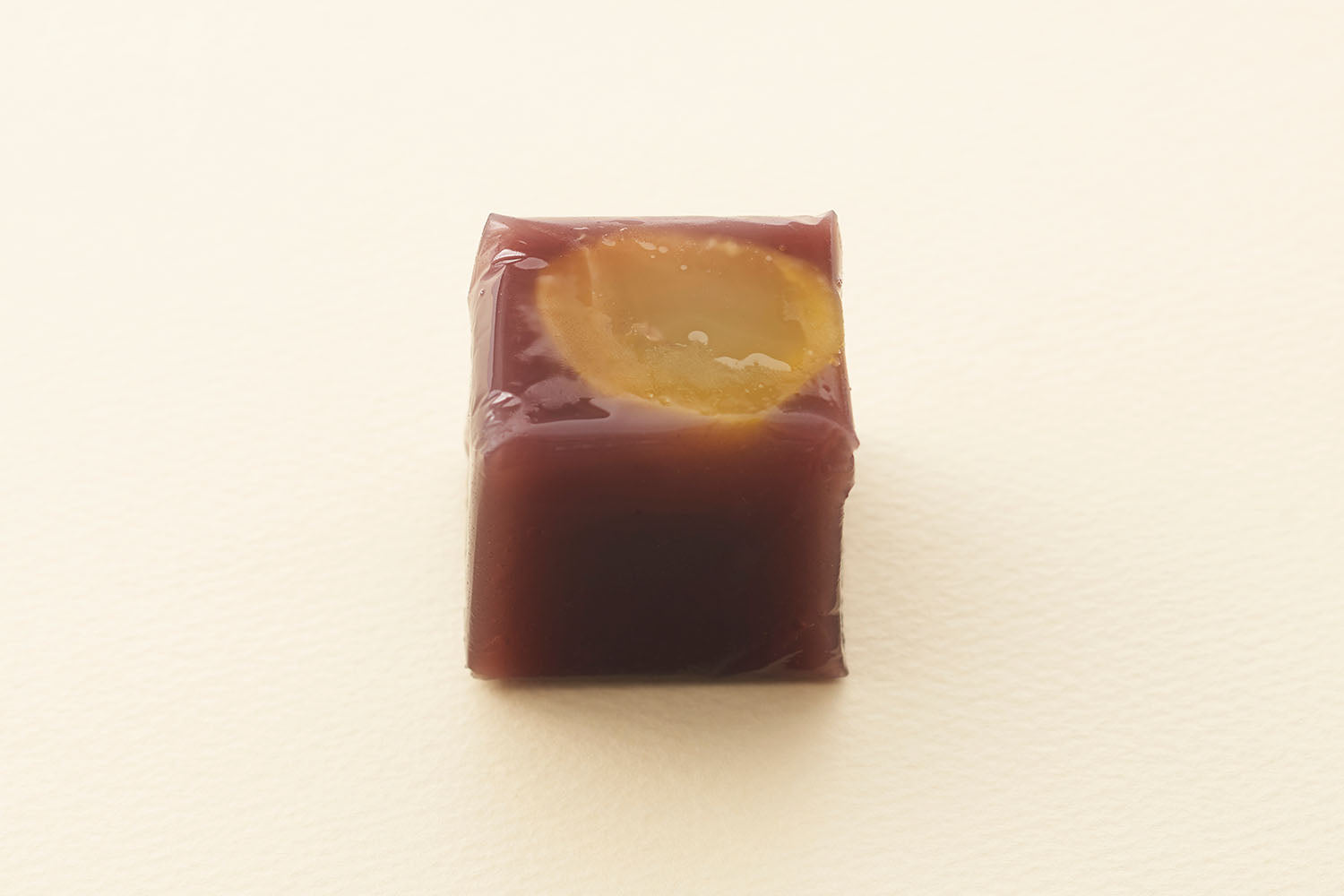 ひと粒の栗をほっくり炊いて、じっくりと練り上げた羊羹で包みました。栗の色合いが美しく映えて夜の月のような風情。濃厚な風味は、お店でも評判の一品です。