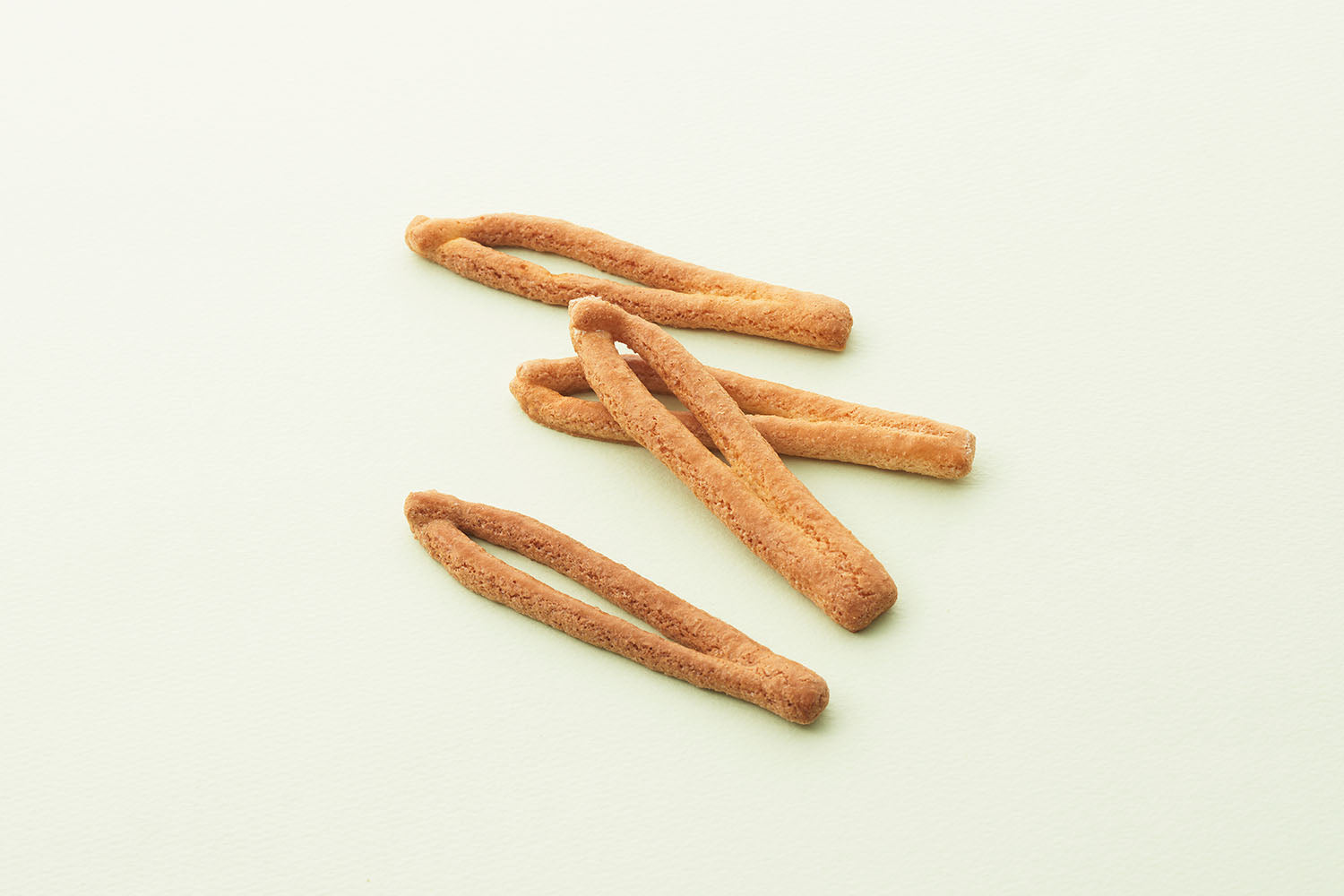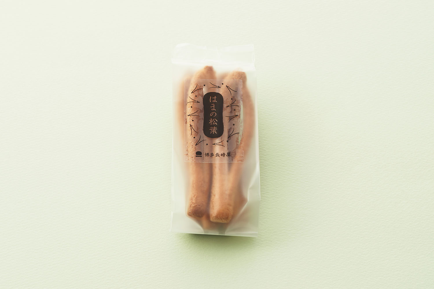 松の葉を見立てた焼き菓子は、小麦粉と卵、砂糖を活かし、パリッと焼き上げた素朴な味わい。街並みが変わりゆくも、地元で愛される百道(ももち)の浜の松林を想い、菓銘をつけました。